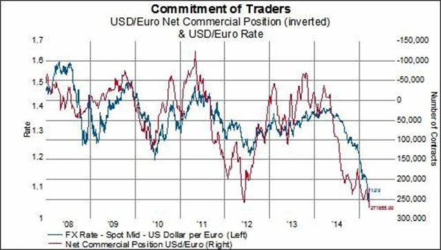 Commercials mají podle zprávy největší čistou dlouhou pozici v americkém dolaru od roku 2000. Proti poklesu hodnoty evropské měny se zajišťují dokonce více než v červnu 2012, kdy se kurz pohyboval na 1,21 EUR/USD.