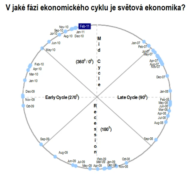 Světová ekonomika se v rámci svého cyklu dostala těsně "ke středu" oživení. Vyplývá to alespoň z lednového průzkumu, který mezi portfoliomanažery provedla Bank of America/Merrill Lynch. V průzkumu, který proběhl přesně před rokem, se většina manažerů domnívala, že je ekonomika v rané fázi oživení, nyní si 75 % portfoliomanažerů myslí, že jsme přibližně uprostřed ekonomického cyklu. Laicky řečeno, stále ještě zbývá třetina koláče, než se opět začneme bát recese.