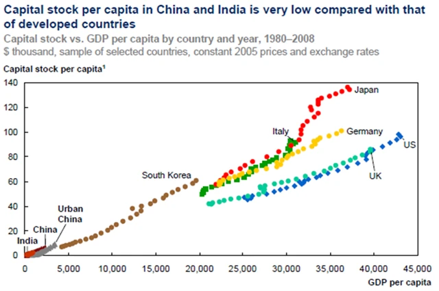 Bublina, nebo boom? 5 jistých znaků spekulativního růstu Pokud se podíváme na graf ze studie společnosti McKinsey zobrazující absolutní zásobu kapitálu na osobu, Čína i Indie mají před sebou potřebu akumulace kapitálu po mnoho dalších let. Tato potřeba akumulace kapitálu pramenící především z titulu urbanizace a industrializace bude držet silnou poptávku po průmyslových komoditách.
