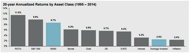 Zatímco S&P 500 za posledních 20 let nabídl roční výnos 9,9 % a "nudná" alokace 60 % akcií a 40 % dluhopisů výnos 8,7 %, průměrný investor se musel spokojit s 2,5 %, která mu navíc téměř celá vymazala průměrná 2,4% inflace (v USA). Pokud by investoři věřili v teorii efektivních trhů, měli by plus mínus kopírovat výnos S&P 500, a ne za ním zaostat o 75 %. Jak je to možné?