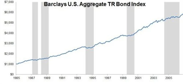 Mnoho investorů v rámci vyčkávání na další kroky Fedu již zhruba dva roky preferuje dluhopisy s krátkou durací. Riziko plynoucí ze změny úrokových sazeb je reálné, ale jen málokdy už slyšíme o stejně reálných výhodách vyšších sazeb. Investoři při nich například mohou reinvestovat kupóny při vyšším výnosu. Jak je patrné z grafu, dluhopisoví investoři během posledních pěti zvyšování sazeb netratili (nemluvě o penzistech a jejich konzervativních portfoliích).