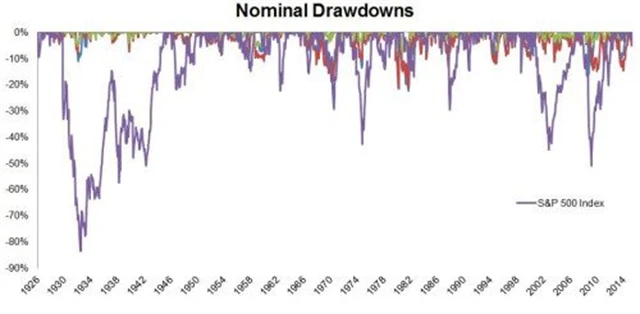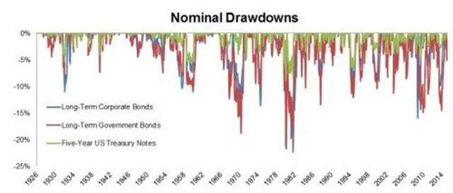 Akcie jsou navíc náchylnější klesat hlouběji. Dluhopisy "nekrachovaly" historicky stejnou měrou jako akcie. Nejhorší nominální tříletý výnos dlouhodobých vládních dluhopisů byl -18 %, zatímco v případě akcií -82 %.