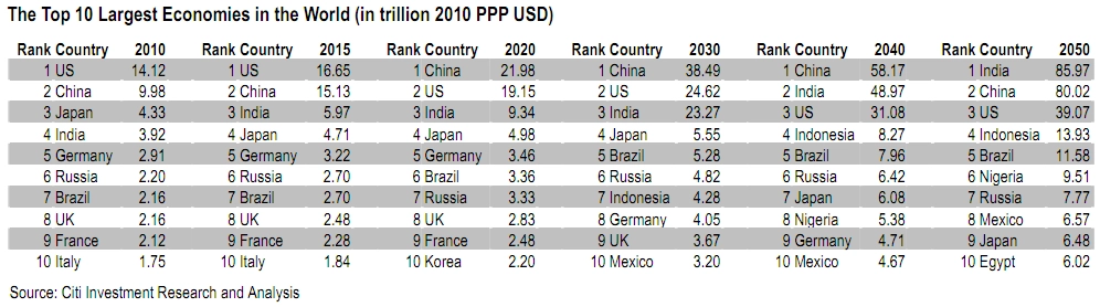 Čína by měla předběhnout USA a stát se největší ekonomikou světa do roku 2020, poté ji překoná Indie okolo roku 2050. Naopak současný podíl států Severní Ameriky a západní Evropy, který v současnosti dosahuje okolo 40 % světového HDP (přepočteno paritou kupní síly), by měl dosáhnout pouze 18 % v roce 2050.