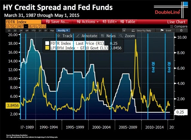 Minulý týden Gundlach během svého vystoupení v New York Yacht Club investory upozornil na graf, který ukazuje, jak na růst úrokových sazeb v USA reaguje spread mezi výnosy dluhopisů v investičním pásmu a výnosy takzvaných junk bondů, jak se také jinak vysokovýnosovým dluhopisům říká. Když na přiloženém grafu roste žlutá křivka, hodnota high yield bondů ve srovnání s kvalitními dluhopisy klesá, jelikož růst spreadu značící vyšší náklady na dluhové financování indikuje vyšší riziko bankrotu méně důvěryhodných dlužníků.