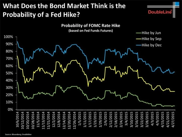 "Jakmile Fed poprvé zvýší sazby, vezměte nohy na ramena," řekl Gundlach poté, co graf okomentoval. Po sérii několika slabších statistik z americké ekonomiky se ohledně načasování prvního zvýšení úrokových sazeb v USA vedou spory. Jakmile se ale Fed ke zvýšení sazeb odhodlá, začnou výnosy všech bondů růst, což by investoři podle očekávání měli vyhodnotit jako signál k návratu ke kvalitním dluhopisům, jejichž výnosy budou rázem mnohem atraktivnější.