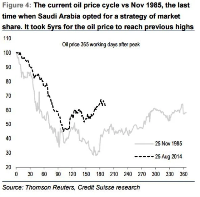V 80. letech, kdy Saúdská Arábie naposledy zvolila strategii obrany tržního podílu, trvala "válka" pět let, než se ceny vrátily na původní úroveň. Znamená to, že bychom se neměli bát o ropu za 80 USD za barel nebo dražší do roku 2019. Rijád navíc irituje skutečnost, že si surovina aktuálně vede daleko lépe než koncem 80. let, kdy byly naposledy aktivně stlačovány ceny.