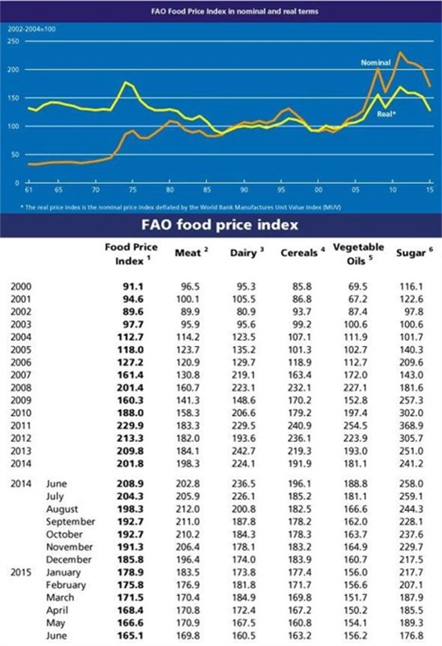 Podle FAO v červnu dále klesly světové ceny potravin (oproti květnu klesl index FAO o 0,9 %). Nejvíce zlevnil cukr a mléčné výrobky. Ceny tlačí dolů vysoká produkce ve světě, silný dolar a levnější ropa.