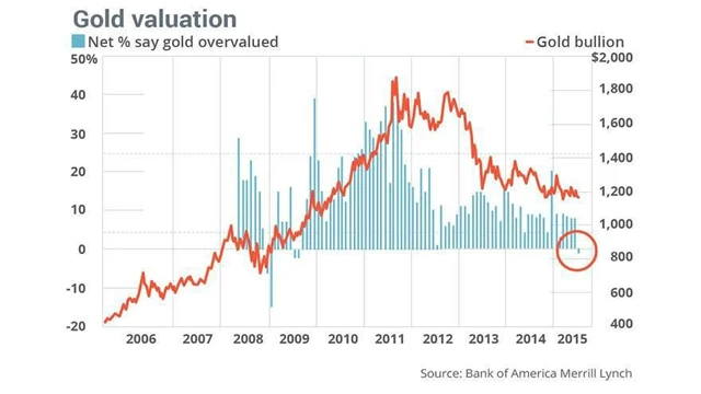 Zlato zlevňuje poměrně dlouho a ztrácí zejména v porovnání s ostatními druhy aktiv, jako jsou akcie, oproti nimž je na nejnižších úrovních od pádu Lehman Brothers. Správci fondů jsou vůči zlatu skeptičtí delší dobu. Žlutý kov byl pro ně většinou nadhodnocený i v dobách mezi lety 2003 a 2011, kdy jeho cena stabilně rostla ze 400 USD za unci až k 1 900 USD za unci. Růst ceny zlata byl očekáván pouze v roce 2009, krátce předtím, než cena vystřelila na maxima.