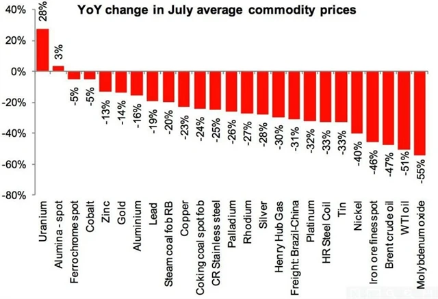 Fanfáry pro vítěze komoditního závodu za uplynulých 12 měsíců patří uranu. Jako jediný by si v grafu zasloužil zelený sloupeček. No dobře, ještě hliník.