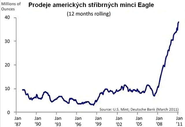 Růst cen stříbra naprosto zastiňuje jindy třpytivější zprávy o zlatě. Proč? pro drobné investory jsou stříbrné mince zkrátka mnohem dostupnější. Podle Financial Times tak v posledních čtvrtletích prodeje stříbrných mincí dosahují rekordních objemů. Ačkoli je v zásadě preferování stříbra na úkor zlata stejně nelogické jako preferování akcií AAA Auto před ČEzem, uvedený graf prodejů amerických mincí Eagle mluví zcela jasnou řečí.