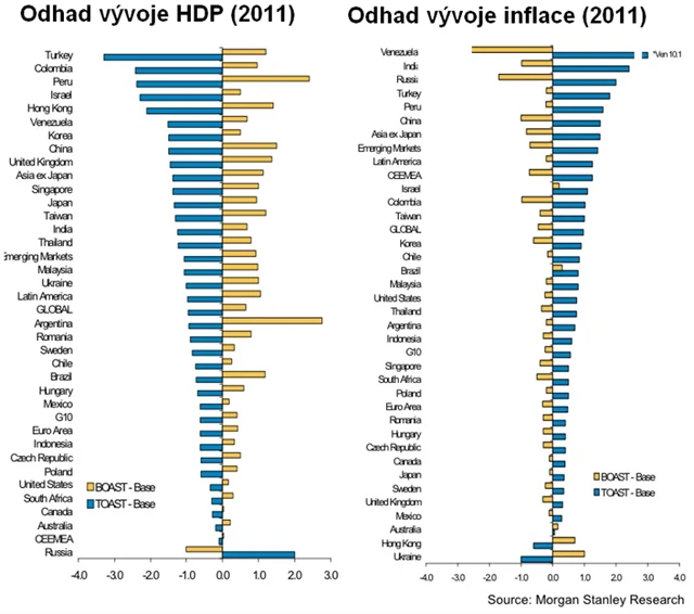 TOAST or BOAST - anglická slovní hříčka z dílny analytiků Morgan Stanley skrývá odpověď na zásadní otázku, jaký vliv budou mít ceny ropy na světovou ekonomiku, potažmo na mezinárodní obchod. Morgan Stanley vypracovala prognózu vývoje ekonomik v jednotlivých zemích. Graf zobrazuje procentuální odchylku od současného odhadu vývoje HDP a inflace z dílny Morgan Stanley.
