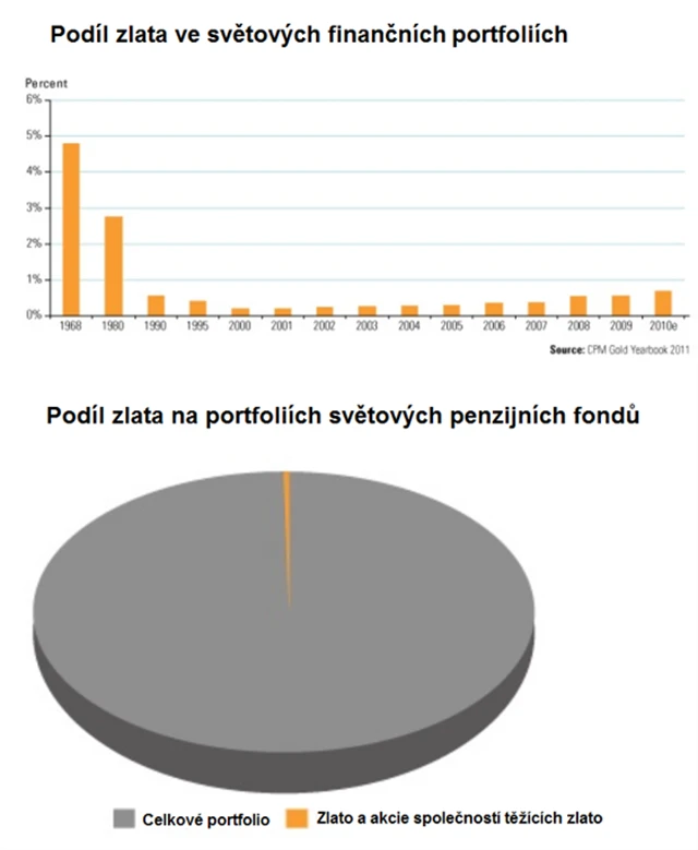Alespoň si to myslí Frank Holmes, redaktor specializovaného investičního portálu Mineweb.com, který několika grafy velmi zručně popírá argumenty některých analytiků, kteří si myslí, že se na cenách zlata vytvořila bublina. Podíl zlata ve světových portfoliích byl v roce 1968 okolo 5 procent. V roce 1980 se zmenšil na 3 procenta a v poslední dekádě činí zanedbatelné 1 procento. "V porovnání s dalšími typy investic v portfoliích velkých hráčů, například penzijních fondů, je podíl zlata překvapivě triviální, a proto není důvod, aby se cena zlata během pěti let nezdvojnásobila," odhaduje Frank Holmes.
