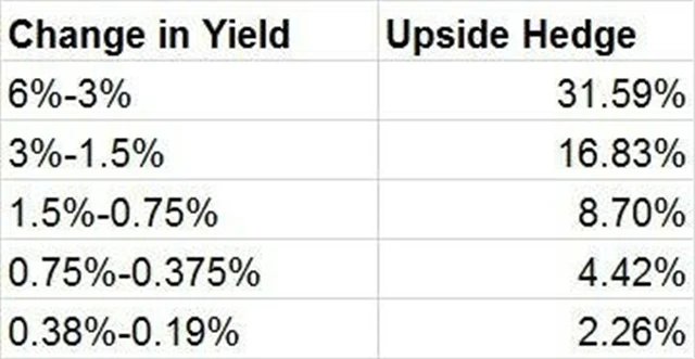Klesající výnosy dluhopisů znamenají nelichotivý výhled na zajišťovací funkci bondů. Při výnosech blížících se nule je výrazně oslabena možnost růstu cen. Z tabulky je patrné, s jakou ochranou mohou investoři počítat při postupném 50% poklesu výnosů 10letých dluhopisů z úrovně 6 % až na 0,19 %.