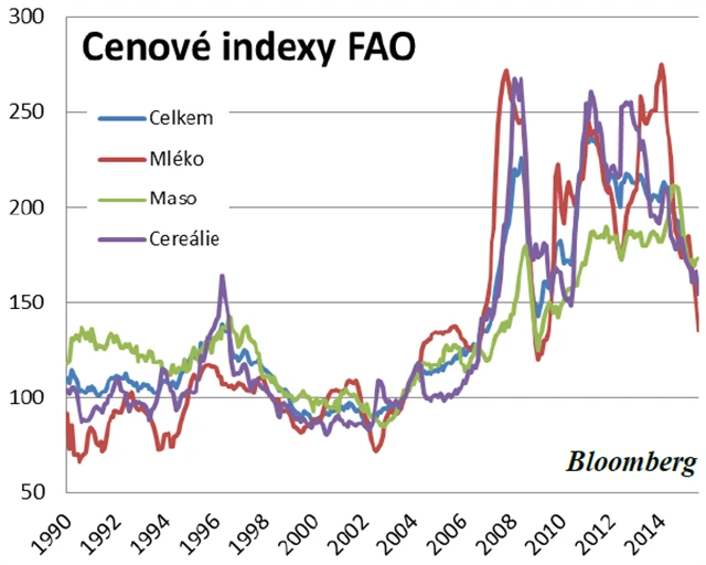 Zatímco dolarové ceny pšenice a kukuřice v poslední době poněkud poporostly, sója prošla od poloviny srpna hlubokým propadem (přes 16 %). Pšenici a kukuřici pomáhá sucho na Ukrajině a v Rusku a nepříznivé počasí v Austrálii. Obecně však přetrvává trend poklesu cen zemědělských komodit, jak ukazuje graf vývoje cenových indexů organizace FAO.