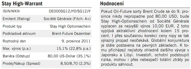 Nižší ceny z uplynulých dnů způsobily, že došlo ke zvýšení volatility. Pro takové tržní podmínky jsou ideální struktury typu Stay High-Warrant. Odpovídající produkt má v nabídce Société Générale (ISIN DE000SG12JY0). Tento finanční instrument nabízí šanci dosáhnout výnosu ve výši 15,1 procenta nebo v přepočtu 22,8 procenta p.a., pokud ropa Brent do 9. prosince 2011 ani jednou nepoklesne pod 80 USD za barel. To odpovídá odstupu od bariéry ve výši 35,1 procenta.