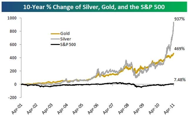 O strmém posilování stříbra v posledních měsících bylo napsáno hodně. Pohled na desetiletý graf vývoje ceny zlata, stříbra a amerických akcií (index S&P 500) tak vyznívá jednoznačně. Zlato se se svým téměř pětinásobným zhodnocením může jít "vycpat", akcie si mohou podat ruku tak možná s úroky na běžném účtu.