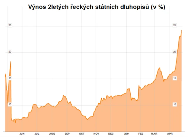 Je to již téměř rok, co Řecko dostalo společný záchranný balíček od EU a MMF. Výnos dvouletých státních dluhopisů po něm citelně propadl, od té doby však důvěra investorů ve schopnost splácet řecký dluh klesá, což se projevuje růstem výnosu na státních dluhopisech. Aktuální výnos 2letých státních dluhopisů v posledních dnech navíc strmě vyskočil až k 25 procentům. Výnos dluhopisů přitom roste, když cena dluhopisů klesá.