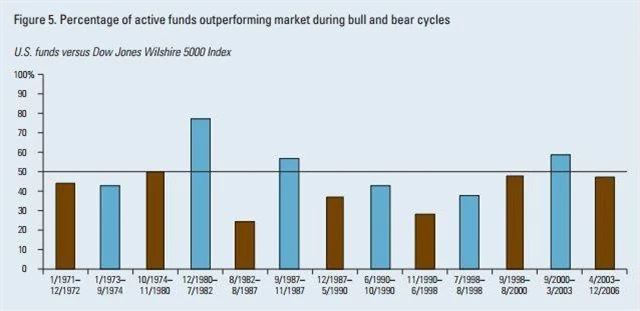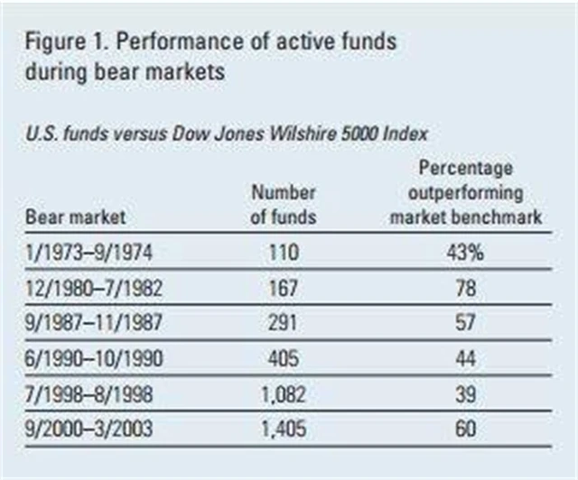Ze studie společnosti Vanguard (typický pasivní správce, který nabízí jedny z nejlevnějších fondů) z roku 2008 vyšlo najevo, že aktivně spravované fondy v USA překonaly trh v polovině případů medvědích trhů.