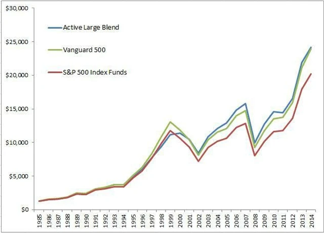 Obrázek níže ukazuje příklad, kdy firma láká investory na fond fondů složený z aktivně spravovaných fondů ze skupiny Morningstar Large Blend. Porovnáván je s ukazatelem Morningstar S&P 500 Tracking Category (klidně se pokuste proniknout do toho, o co přesně jde). Na horizontu let 1985 až 2014 je do srovnání přidán ještě nízkonákladový fond Vanguard 500. Active Large Blend samozřejmě vítězí. Je ale otázka, kolik fondů tvůrci fondu do portfolia vybrali, aby jim to tak hezky sedělo.