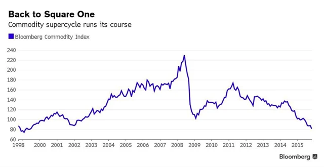 Bloomberg Commodity Index, který reflektuje vývoj cen 22 komodit, se z vrcholu, kterého dosáhl v polovině roku 2008, sesunul již o dvě třetiny a je na nejnižší úrovni od roku 1999. Změnu trendu (či konec komoditního supercyklu) nedokázala zvrátit ani Čína. Po roce 2009 sice přišel odraz, ten ale trval jen něco málo přes dva roky.