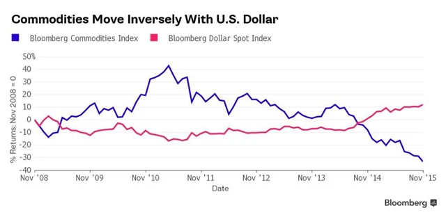 Zpomalování hospodářského růstu Číny ale není to jediné, co má na situaci na komoditních trzích vliv. Posledním hřebíčkem do rakve komodit může být první pokrizové zvýšení úrokových sazeb v USA. Očekávání růstu úrokových sazeb totiž posiluje americký dolar, což na komoditních trzích snižuje kupní sílu neamerických obchodníků. Patrné je to z negativní korelace komoditního a dolarového indexu, který sleduje sílu amerického dolaru vyjádřenou vůči šesti dalším hlavním světovým měnám.