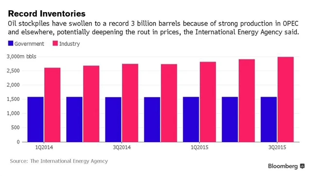 Snad největší převis nabídky nad poptávkou je patrný na trhu s ropou, přestože ceny černého zlata se od června 2014 propadly přibližně o 60 %. Podle údajů Mezinárodní agentury pro energii (IEA) celosvětové zásoby ropy dosáhly ve třetím kvartálu historického maxima 3 miliardy barelů. Důvody jsou v zásadě dva - boom těžby v amerických břidličných pánvích a neochota Organizace zemí vyvážejících ropu (OPEC) snížením těžby přispět ke stabilizaci cen suroviny na trzích.