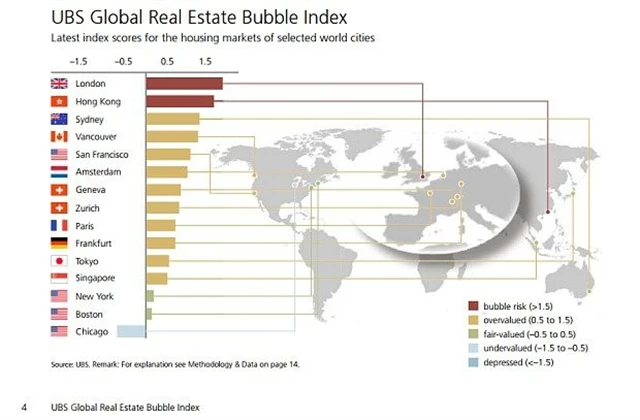 Index bubliny cen světových nemovitostí, který UBS sestavuje, svítí varovně červenou hned na několika místech. Proto se Haefele nechce vydat cestou suverénních fondů. Za méně rizikové považuje v současnosti akcie, zejména ty japonské V Japonsku centrální banka skoupila 54 % trhu ETF a chce jít ještě dále.