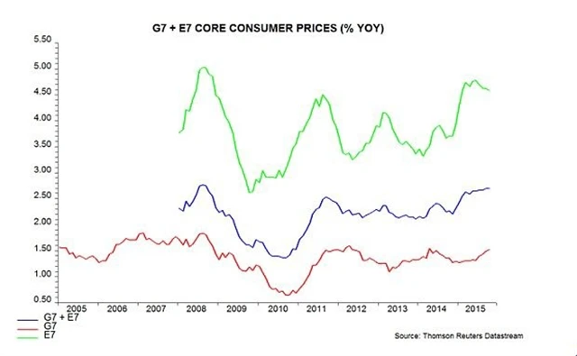 Světová jádrová inflace, měřená kompozitním indexem Henderson Global Investors pro G7 a E7, koncem roku 2014 vzrostla na sedmileté maximum 2,7 %.