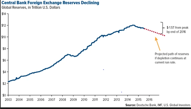 Data MMF poukazují na skutečnost, že tyto rezervy za 12 měsíců do června 2015 klesly o 550 miliard USD. Na vině byl odliv kapitálu a propad cen komodit, který země donutil přistoupit k obraně měn. Saúdská Arábie stále pálí kolem 12 miliard USD měsíčně, aby vůbec pokryla deficity státního rozpočtu.