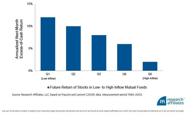 Společnost Research Affiliates nabízí zajímavou dvojici grafů, které na tento problém poukazují. Je z nich jasně patrné, že rostoucí toky peněz do fondů jsou celkem spolehlivým signálem příští podprůměrné výkonnosti. Honění se za výkonností je zničující pro zhodnocení všech typů produktů.