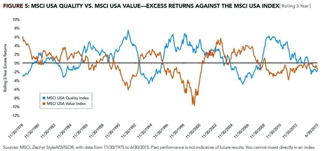 Jeremy Schwartz ze společnosti WisdomTree přišel se zajímavým grafem, z kterého jen patrné, jak různé strategie nabízejí nadvýkonnost v jiných periodách. Index MSCI USA Quality sleduje velké a střední americké společnosti na základě tří fundamentálních ukazatelů (rentability vlastního kapitálu, kolísavosti výnosů a poměru dluhů k vlastnímu kapitálu), MSCI Value USA pak vyhledává podhodnocené velké a střední společnosti v USA. Výkonnost obou indexů je téměř ideálně záporně korelovaná se střídáním období zisků i ztrát. Diverzifikace do obou indexů by mohla představovat mnohem hladší výnosovou křivku.