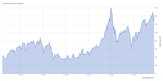Buffett používá k měření ocenění akcií poměr hodnoty amerických akcií a velikosti americké ekonomiky. V prosinci napsal, že "je to možná ten nejlepší ukazatel toho, jaké je ocenění v každém daném okamžiku". A jak je vidět, ocenění amerických akcií se blíží tomu z období před prasknutím technologické bubliny.