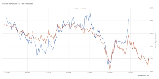 Hodnota ukazatele tkví v tom, že poměrně přesně říká, jaké výnosy lze očekávat v následujících deseti letech. "Cena, kterou zaplatíte, určuje váš výnos," říká Buffett. Ti, kdo mohli v 80. letech zaplatit nízkou cenu, dosáhli na velice zajímavé výnosy. Ale ti, kdo nyní nakupují draze (podobně jako před dvaceti lety), mohou s velkou pravděpodobností očekávat v následujících deseti letech chabý výkon akcií. Z grafu níže je patrné, že ti, kdo nakupují nyní, mohou očekávat výnosy (včetně dividend) okolo -2 % za rok.