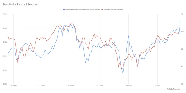 Na posledním grafu je rozdíl mezi skutečnými a prognózovanými výnosy dohromady s indexem spotřebitelské důvěry Michiganské univerzity. A je celkem jasné, že nadměrné výnosy lze téměř bezezbytku vysvětlit optimismem na trhu. Když k tomu přičteme fakt, že rozdíl mezi skutečnými a prognózovanými výnosy je ještě vyšší než na vrcholu technologické bubliny, jde o velice solidní důkaz existence nepřiměřené euforie vyvolané nejdelším růstovým obdobím s minimální volatilitou v historii.