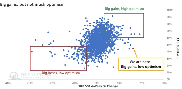 Skutečné dno se přitom na trzích zpravidla vytvoří až tehdy, když zavládne maximální pesimismus. Nyní akcie za pár týdnů posílily o více než 20 %, ačkoli indikátor nálady investorů Americké asociace individuálních investorů hlásí, že většina těchto hráčů očekává další poklesy. V minulosti se přitom prakticky nestalo, že by po tak výrazných růstech panoval takový pesimismus. Tip na vývoj v nejbližším období je tedy skutečná loterie.