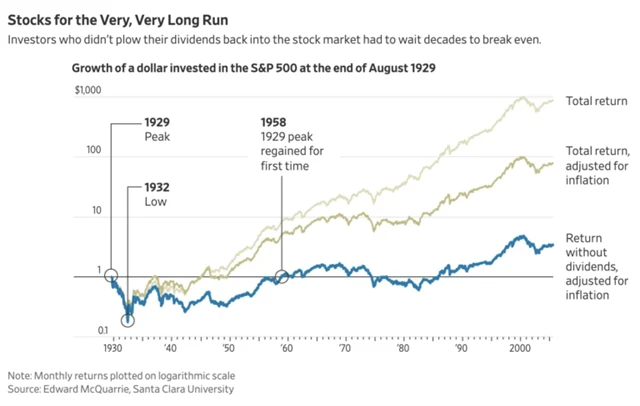 Záleží na tom, jak zhodnocování akcií počítáme. Pokud budeme brát v potaz jen vývoj akciového indexu, smazal Dow skutečně všechny ztráty až za zhruba tři desetiletí. Pokud bychom ale růst cen akcií navýšili ještě o zisky z reinvestování dividend, zkrátil by se tento horizont asi o 10 let.