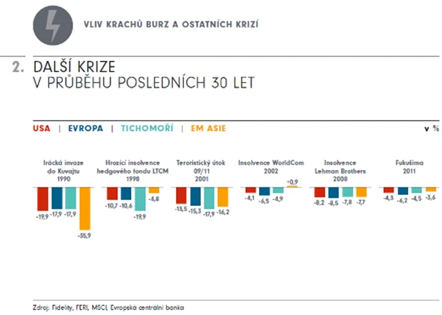 Četné jiné krize způsobily krátkodobé zhroucení akciových trhů po celém světě. Šlo například o přírodní katastrofy (zemětřesení a vlna tsunami, které vedly k vážné havárii v jaderné elektrárně ve Fukušimě), platební neschopnosti velkých amerických společností (Lehman Brothers, Worldcom), teroristické útoky 11. září 2001 a invaze iráckých jednotek do Kuvajtu v roce 1990. "Je překvapivé, že v případě války nebo teroristického útoku byly cenové výkyvy amerického akciového trhu (MSCI USA Price Index) menší než v Evropě (MSCI Europe Price Index) nebo v Asii, i když se tyto události odehrály v USA," upozorňuje Lessing. A platí to v případě cen v eurech i dolarech.