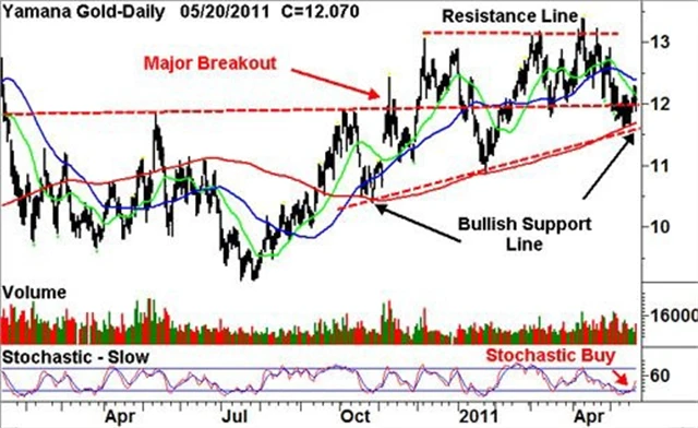 Kanadský těžař zlata se v dubnu dostal na maxima nad 13 USD ,ale v květnu korigoval pod 12 USD. V uplynulém půlroce patří akcie mezi analytiky k nejoblíbenějším v rámci "zlatého" sektoru.