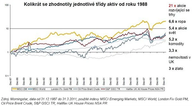 Tisíc dolarů investovaných na konci roku 1987 do indexu rozvíjejících se trhů (MSCI Emerging Markets) by se na konci března tohoto roku zhodnotilo na 21 tisíc dolarů, tedy jednadvacetkrát. Tak vysokého růstu žádná jiná investice na tomto horizontu, dlouhém více než 23 let, nedosáhla.
