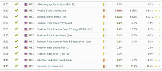 Z ekonomických dat dopoledne přišla série ukazatelů z britského trhu práce. Míra nezaměstnanosti ve Spojeném království během tří měsíců od října do prosince zůstala na 5,1 %, očekávalo se snížení na 5 %. Týdenní očištěná mzda ve stejném období zrychlila meziroční růst na 2 % z předchozích 1,9 %, čekalo se naopak zpomalení růstu na 1,8 %. Zaměstnanost za uvedené tři měsíce vzrostla o 205 tisíc (čekal se růst o 225 tisíc po předchozích 267 tisících). Zároveň byl zveřejněn údaj o počtu nových žadatelů o podporu v nezaměstnanosti za leden - klesl o 14 800, čekal se pokles o 3 tisíce po předchozím revidovaném poklesu o 15 200.