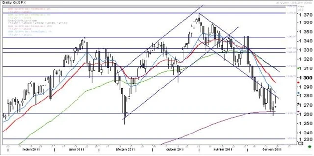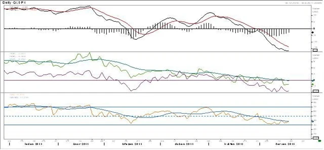 Většina technických indikátorů ukazuje na další pokles indexu S&P 500. V současné době je 200denní klouzavý průměr významnou a jedinou oporou, která brání dalšímu výraznějšímu poklesu cen akcií. V posledních se dnech právě od tohoto průměru odrazily akcie vzhůru, presto očekáváme v blízké době znovu testování této hranice podpory nacházející se okolo hodnoty 1 260. Každopádně pro nejbližší dny spíše vidíme prostor pro mírný růst indexu na základě přeprodanosti, jak ukazuje indikátor RSI.