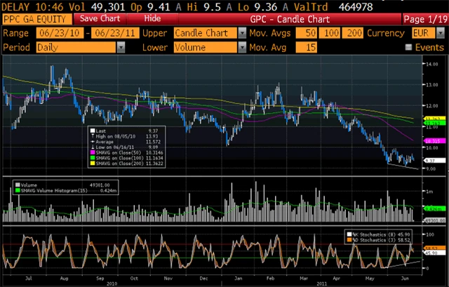 Akcie se v současné době obchodují za 9,5 EUR, což je zhruba 30 % pod průměrným doporučením analytiků, kteří pokrývají tento titul. Poměr ceny akcie k ziskům firmy (P/E) se pohybuje kolem 5,5.