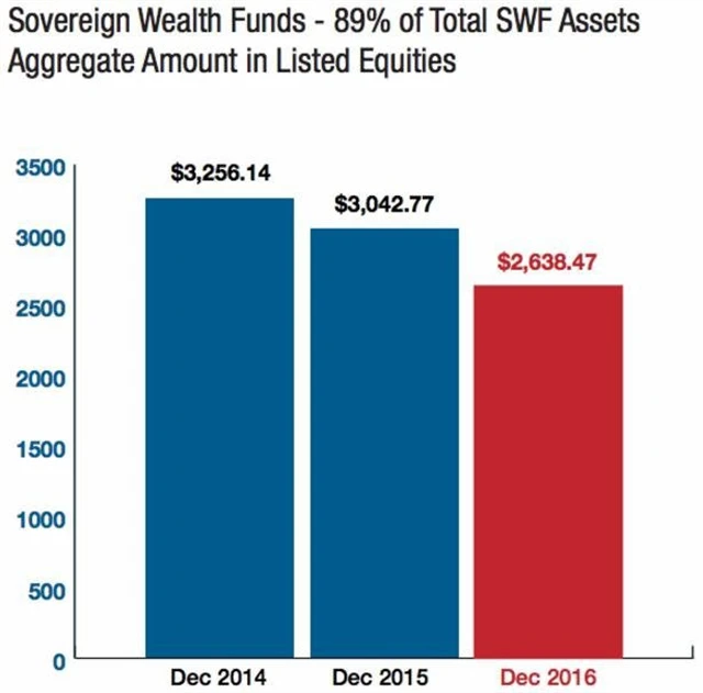Hodnota pozic suverénních fondů v akciích by mohla letos klesnout na 2,64 bilionu USD, uvádí SWFI. Ještě na konci roku 2015 přitom fondy držely 3,04 akcie za bilionu USD.