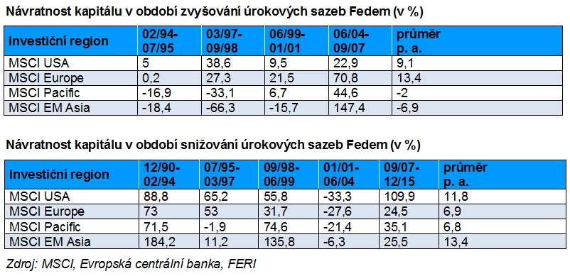 Od prosince 1991 do prosince 2015 proběhly čtyři fáze zvyšování a pět fází snižování úrokových sazeb. Během zvyšování úrokových sazeb dosáhl americký akciový trh (podle indexu MSCI USA) průměrného ročního výnosu 9,1 %. Evropský akciový trh (podle MSCI Europe) narostl během těchto období o 13,4 %. Jen pro porovnání, akciové trhy v Tichomoří a na asijských rozvíjejících se trzích dosáhly záporných výnosů (-2,0 až -6,9 %). Během pěti období snižování úrokových sazeb byla roční výkonnost akciových trhů ve Spojených státech amerických 11,8 % a v Evropě 6,9 %. Akciové trhy v Tichomoří a asijských rozvíjejících se trzích se během tohoto období vyvíjely také velmi pozitivně a dosáhly průměrných ročních výnosů 6,8 % a 13,4 %.