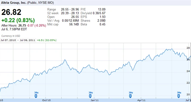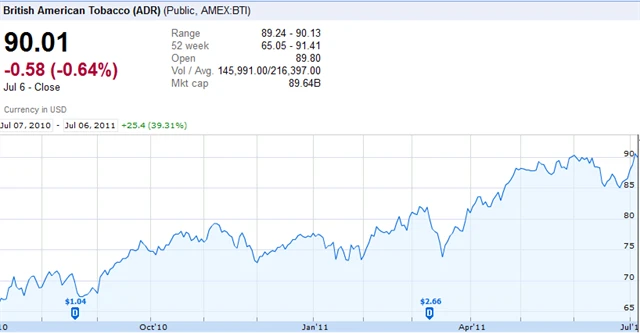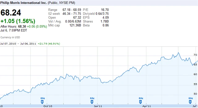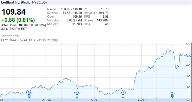 Po soudních sporech rozhodnutých ve prospěch cigaret této značky vystřelily akcie šíleným tempem. V dalších týdnech akcie sestoupila zpět pod 100 USD, aby se brzy dostala opět na úroveň okolo 110 USD. Nejde tedy rozhodně o investici pro slabé nátury.