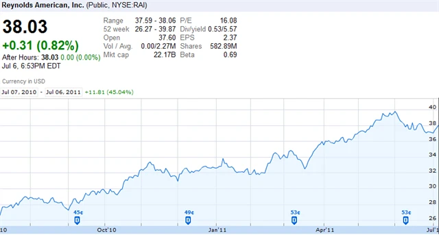 Reynolds American vyplatila poslední čtvrtletní dividendu 53 centů. A stejně jako u Altrie je 5letý odhad ročního růstu EPS 6,7 % nižší než průměr odvětví.