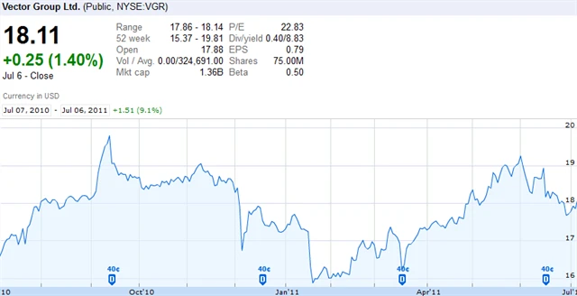 Dividenda společnosti Vector grooup je 40 centů čtvrtletně, je však dost nepravděpodobné, že by firma vydržela vyplácet dividendy i nadále v takové výši. Rozvaha značí negativní hodnotu majetku -0,84 USD na akcii. Růst EPS analytici odhadují na 11 % ročně po dalších 5 let.