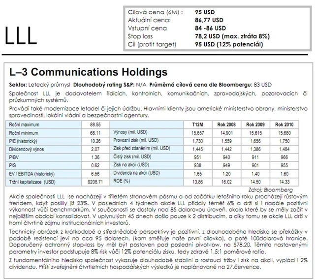L–3 Communications Holdings je dodavatelem řídících, kontrolních, komunikačních, zpravodajských, pozorovacích či průzkumných systémů. Provádí také modernizace letadel či jejich údržbu. Hlavními klienty jsou americké ministerstvo obrany, ministerstvo spravedlnosti, lokální vládní a bezpečnostní agentury. Z fundamentálního hlediska společnost vykazuje dlouhodobě stabilní a rostoucí tržby i zisk na akcii, vyplácí i 2% dividendu.