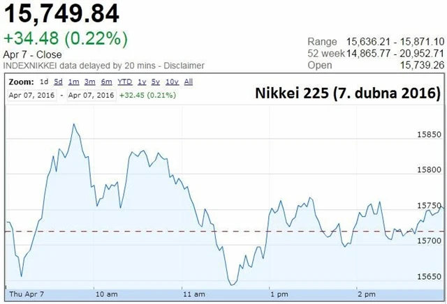 Poté, co se index Nikkei 225 celý den potácel z negativního do pozitivního teritoria a zpět, zamířil před závěrem čtvrtečního obchodování vzhůru a připsal si 34,48 bodů, tedy 0,22 %.