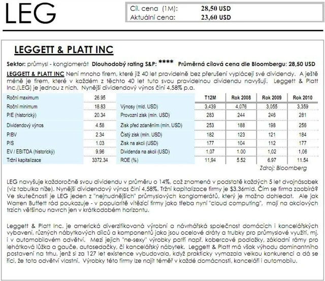 Není mnoho firem, které již 40 let pravidelně bez přerušení vyplácejí dividendu. A ještě méně je firem, které v každém z těchto 40 let svou pravidelnou dividendu navyšují. Leggett & Platt Inc. (LEG) je jednou z nich. Nynější dividendový výnos činí 4,58 % p.a.